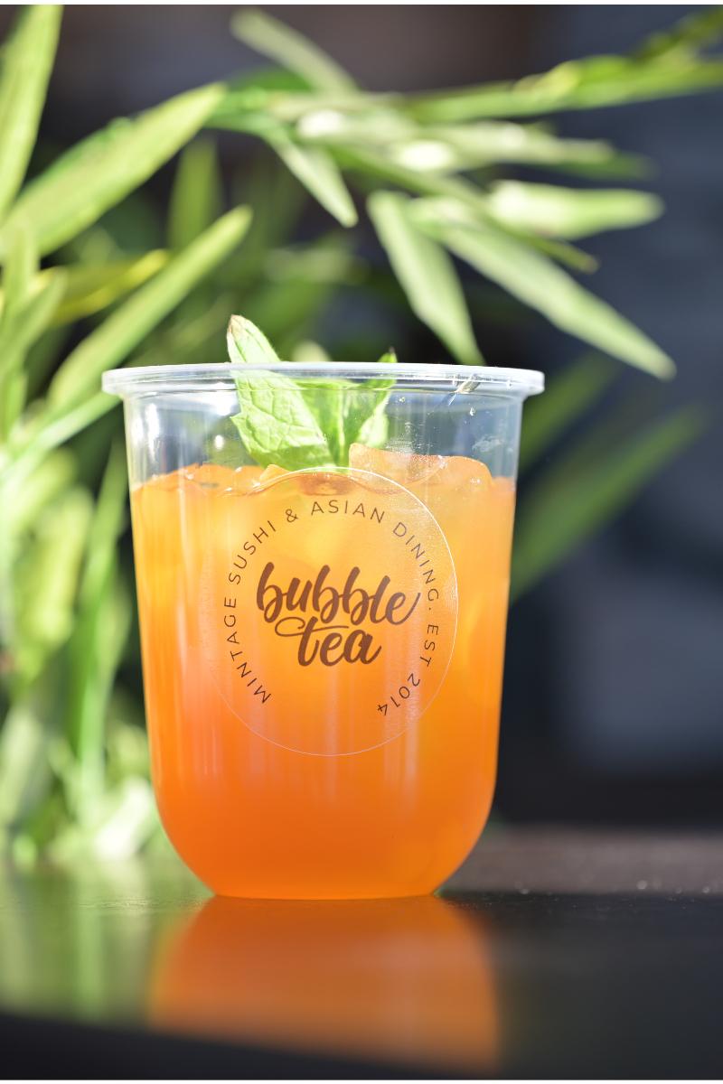 Jasmine mynte te + pasjonsfrukt sirup og popping boba perler.