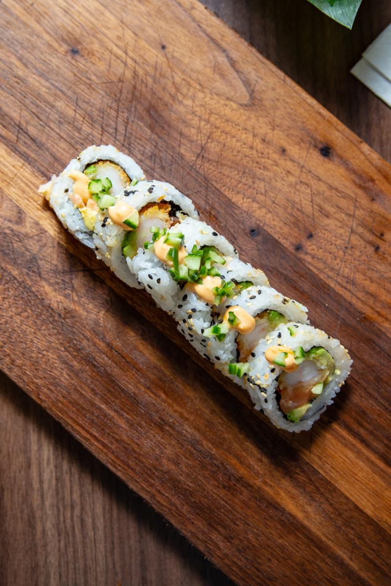 Inneholder: Fritert Scampi, rå laks, Avocado, Agurk, Chilimajonese