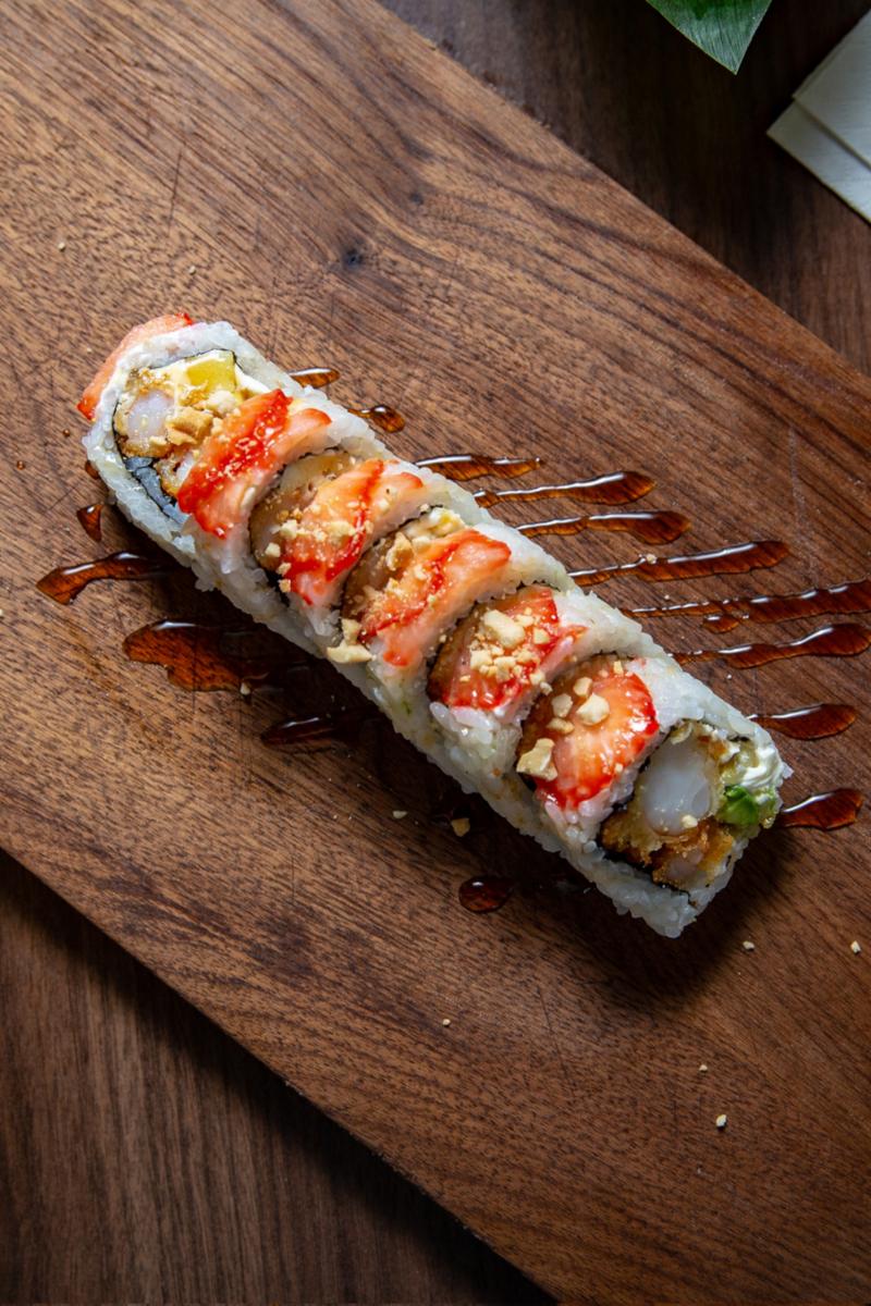 Inneholder: Fritert Scampi, Avocado, Philadelphia ost, Jordbær, Eple, Cashewnøtter og Teriyaki Saus