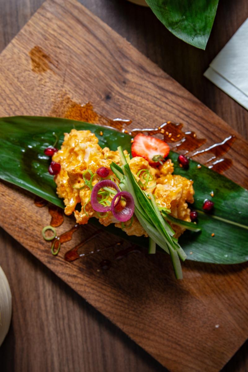 Fritert Scampi rørt i chilimajonese med Avocado, våløk og agurk.